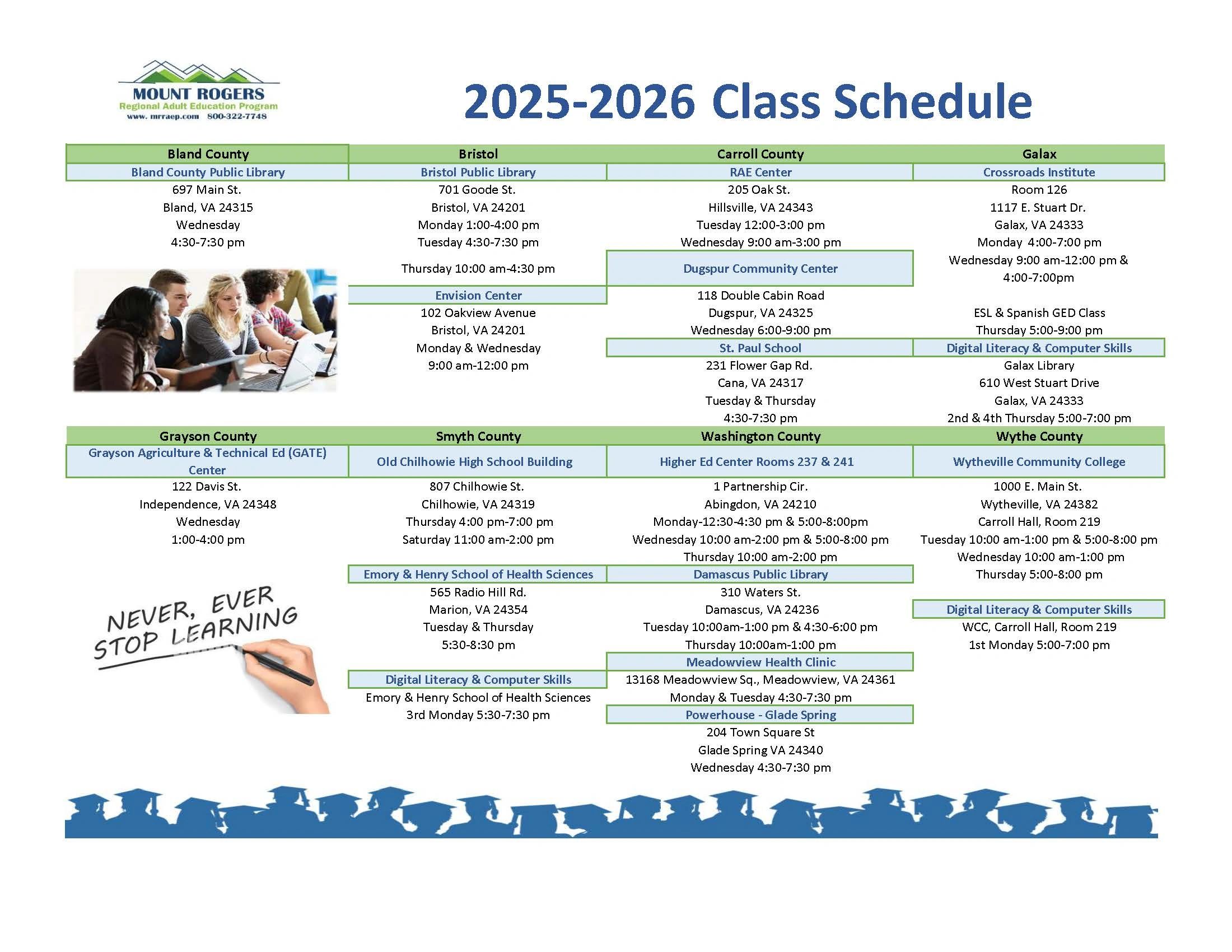 Welcome to The Mount Rogers Regional Adult Education Program(MRRAEP) website The program serves the Virginia counties of Washington, Bland, Carroll, Grayson, Smyth and Wythe and the cities of Bristol and Galax.